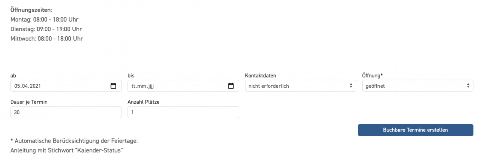 Folgende Angaben sind notwendig, um buchbare Termine erstellen zu können: