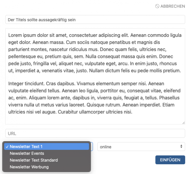 Bei der Erstellung des Newsletters müssen Sie keine Gestaltung programmieren, sondern nur das Gestaltungselement auswählen und dieses mit dem Text füllen.